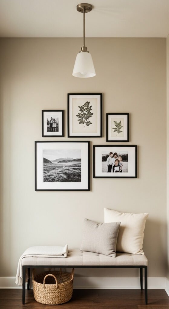 A gallery wall above a bench or console table personalizes an entryway immediately. Keep frames consistent — same finish, similar sizes — so it reads as curated rather than cluttered. Mix family photos with simple art prints, postcards, or pages torn from a calendar. Print photos at a drugstore for under $1 each and frame them with $3 frames from the dollar store. Lay the arrangement on the floor first to plan placement before putting a single nail in the wall. Ten minutes of planning saves a lot of patching later.