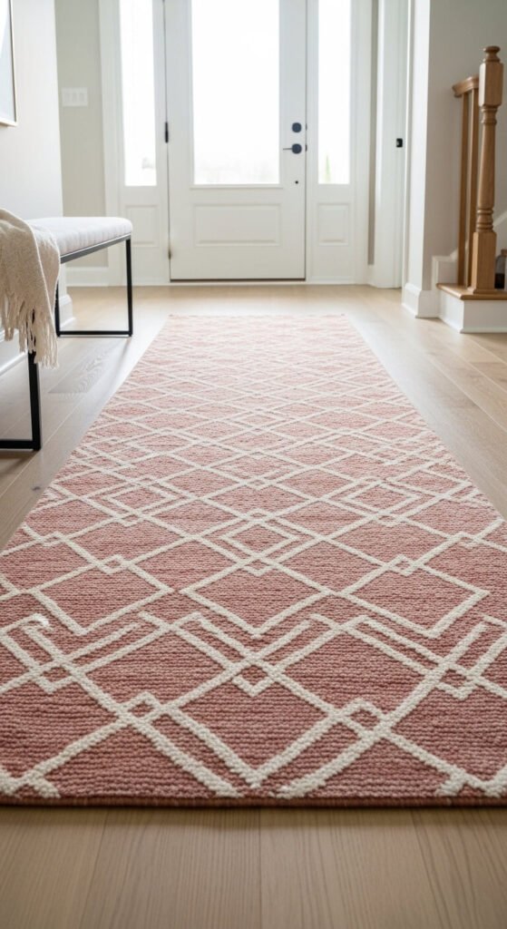 A runner rug does more than protect your floors. It defines the entry zone, adds color and texture, and guides the eye naturally into the rest of the home. Choose a pattern with some visual interest — stripes, diamonds, or a simple geometric print add personality without overwhelming a small space. Natural fiber runners like jute or cotton are affordable ($25–$60) and hold up well near the front door. Layer a non-slip pad underneath for safety and to keep the rug from shifting.