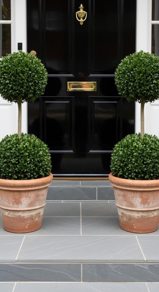 1. Matching Potted Topiaries Flanking the Door