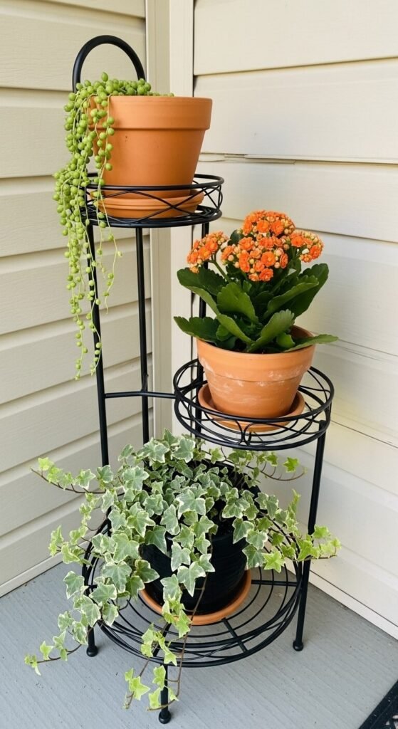 A tiered plant stand lets you display multiple plants in a small footprint — perfect for narrower porches. Use three to five pots in the same material but different sizes for a collected-but-cohesive look. Place the tallest plant at the top, mid-sized plants in the middle, and trailing plants at the bottom to cascade downward. Black powder-coated metal stands cost $25 to $50 online. You can also stack old wooden crates or bricks as a DIY alternative. Change the plants seasonally — the stand stays, the plants rotate. This is one of the most space-efficient porch decor investments available.