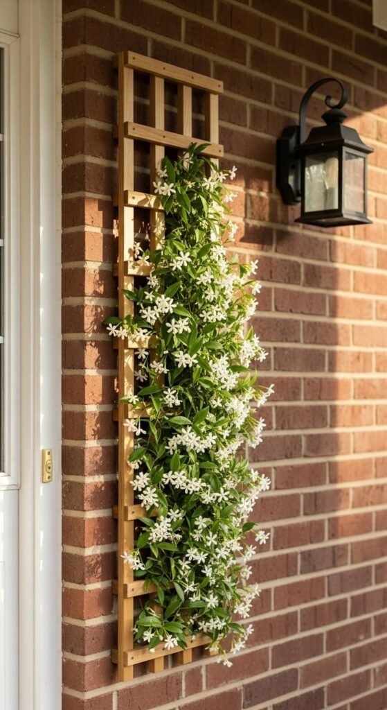 A trellis with a climbing plant transforms a flat wall or column into a living piece of porch decor. Mount a simple cedar or painted timber trellis against the porch wall or beside the door and plant a fast-growing climber at its base. Star jasmine, climbing roses, and sweet peas all work well on a front porch. Star jasmine is particularly good — it is evergreen, produces fragrant white flowers in summer, and grows quickly. A basic cedar trellis panel costs $15 to $25. The climbing plant adds another $5 to $15. Within one season it will begin to fill the trellis naturally.