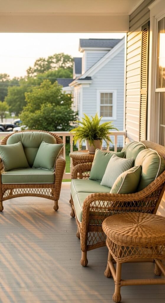 A small wicker seating arrangement turns a porch into an outdoor living room. A loveseat plus one armchair uses less space than two separate chairs and feels more conversational. Choose all-weather synthetic wicker rather than natural rattan — it holds up outdoors for years without deteriorating. Cushions in a solid color rather than a bold print age better visually over time and are easier to replace cheaply. Bring cushions inside during heavy rain to extend their life. A basic wicker set costs $150 to $300 new, but excellent secondhand sets appear regularly on Craigslist and Facebook Marketplace for $40 to $80.