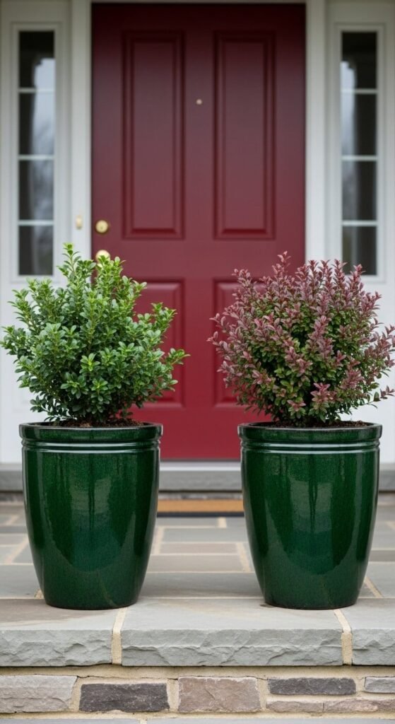 Evergreen shrubs in matching planters give a porch year-round structure that flowering plants alone cannot provide. Choose compact, slow-growing varieties — dwarf Japanese holly, compact leucothus, or dwarf nandina all stay manageable in a large container for several years. Match the planters in color, material, and size for a formal, intentional effect. Dark glazed ceramic, matte black, or classic white all complement most door colors. Good-sized matching planters cost $30 to $60 each. The shrubs themselves cost $15 to $30 per plant. Unlike seasonal flowers, these need watering only once or twice a week and require almost no maintenance beyond occasional trimming.