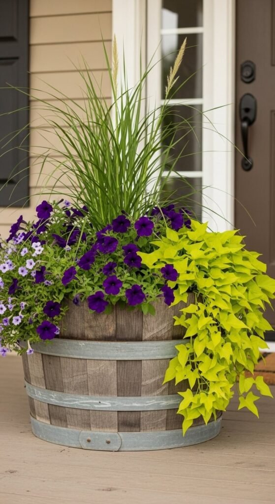 Half-barrel wooden planters suit farmhouse, cottage, and rustic porch styles particularly well. Plant them with a tall central plant anchored by mounding and trailing plants around the edges for a full, generous look. Ornamental grasses, tall salvias, or a standard-trained small shrub all work well as the centerpiece. Barrel planters hold a large volume of soil, which means less frequent watering than smaller containers. New half-barrels cost $25 to $45 at garden centers. Line the inside with plastic sheeting punctured with drainage holes to slow the rotting of the wood. One full barrel placed beside the door makes a statement on its own.