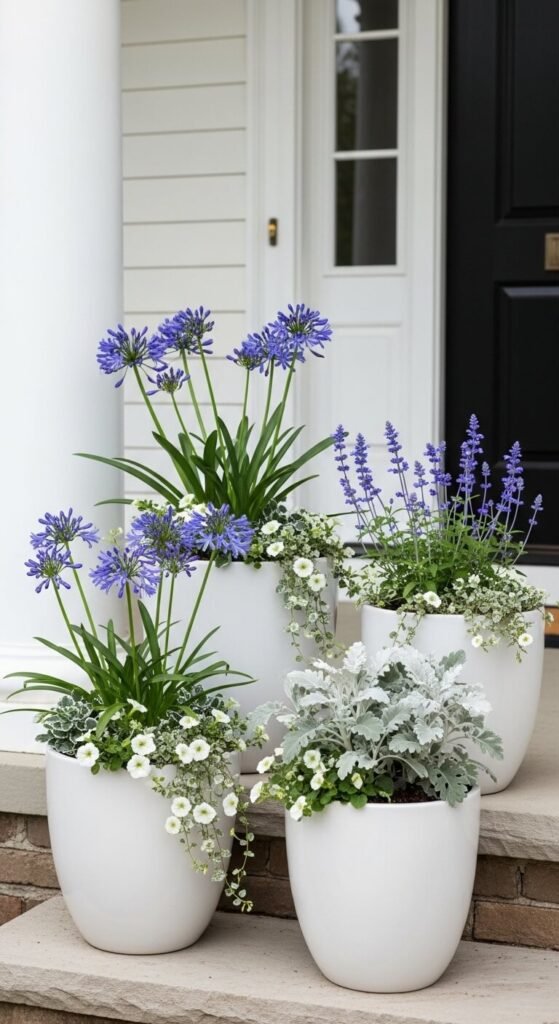 Repeating the same planter color along your porch steps creates a visual rhythm that makes a porch look designed rather than assembled at random. Choose a single planter color — white, black, terracotta, or navy — and use it for every pot on the steps. The plants inside can vary in color and form, but the matching containers hold everything together. Matching planters do not need to be expensive — identical terracotta pots from a garden center cost $4 to $8 each. Even four identical small pots on four steps, each planted with the same flower, creates a far more polished look than four different pots and four different plants.