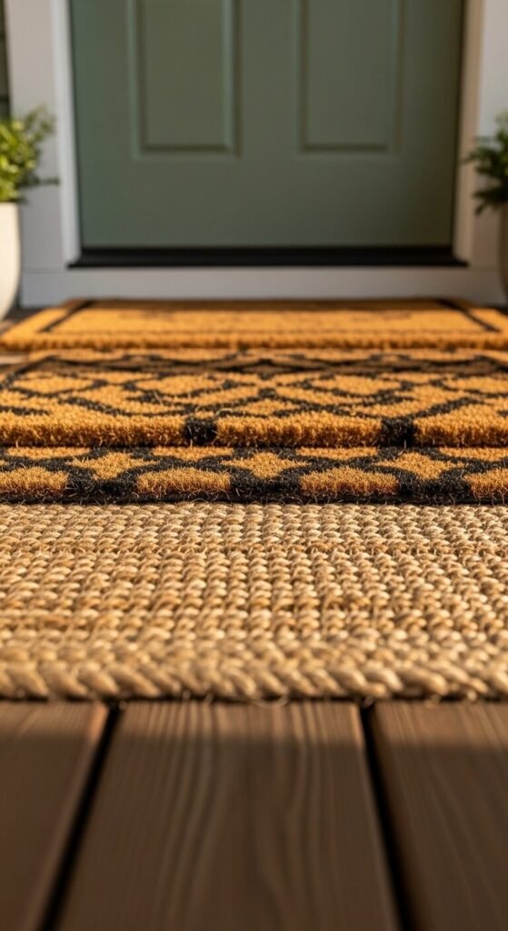 Layering two mats — a large base rug under a smaller doormat — adds dimension and color to a plain porch floor instantly. Use a natural jute or sisal rug as the base and place a smaller coir or rubber-backed doormat on top. The layered look is popular because it adds personality without requiring any permanent changes. Jute rugs are inexpensive — a 2×3 foot size costs around $20 to $35. The inner mat can be swapped seasonally for almost no cost. Keep the base rug neutral and add color or pattern through the inner mat to change the porch mood with the seasons.