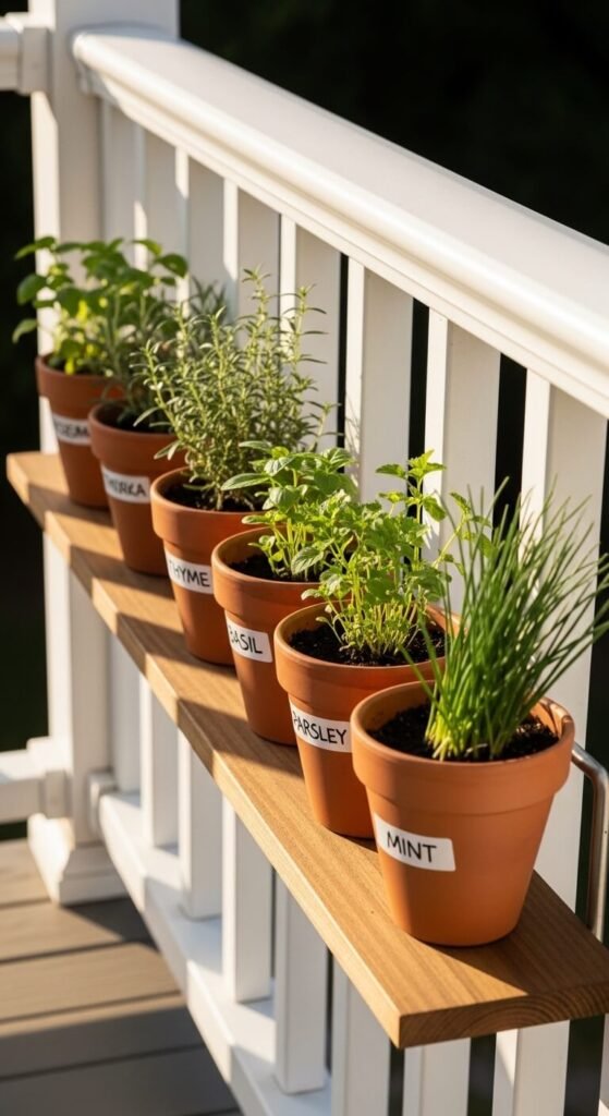 21. Potted Herbs Along a Railing Shelf