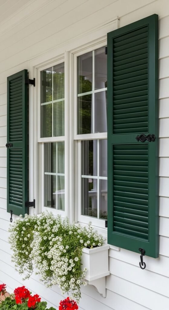Shutters frame porch windows and add architectural depth to an otherwise flat exterior. Use real operable shutters rather than nailed-flat decorative panels — they look far more authentic and can actually close during storms. Wooden shutters painted in a color that matches the front door tie the porch together visually. Deep green, navy, black, and deep red all work well against white or cream painted exteriors. Replacement wooden shutters cost $40 to $80 per pair from lumber yards or home improvement stores. Install with traditional shutter hinges and shutter dogs — small iron hooks that hold the shutters open against the wall when not in use.