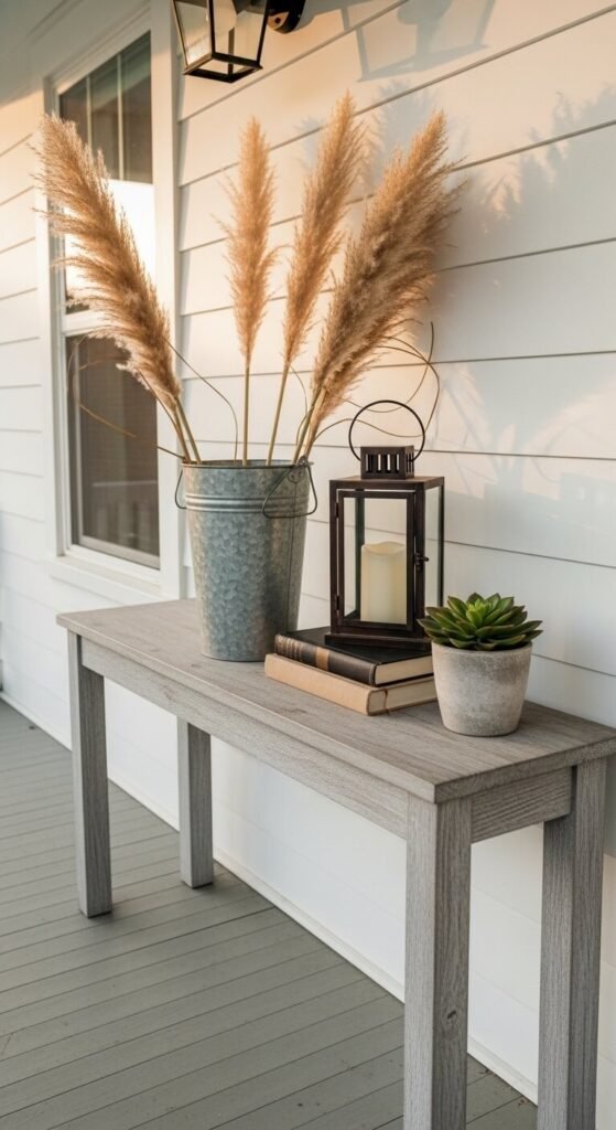A narrow console table against a porch wall creates a styled vignette that feels like an outdoor room extension. Keep it to three to five objects — a tall element, a mid-height element, and a low element. Use a mix of textures: a metal bucket with dried grasses, a ceramic pot, a lantern, and a small piece of driftwood or river stone. The objects should feel collected rather than purchased as a set. Secondhand console tables cost $15 to $40 at thrift stores. Repaint or distress the finish to suit your porch style. Swap out one or two objects seasonally to keep the vignette feeling current without replacing everything.