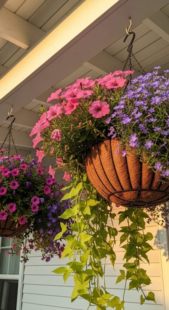 3. Hanging Flower Baskets from Porch Ceiling Hooks