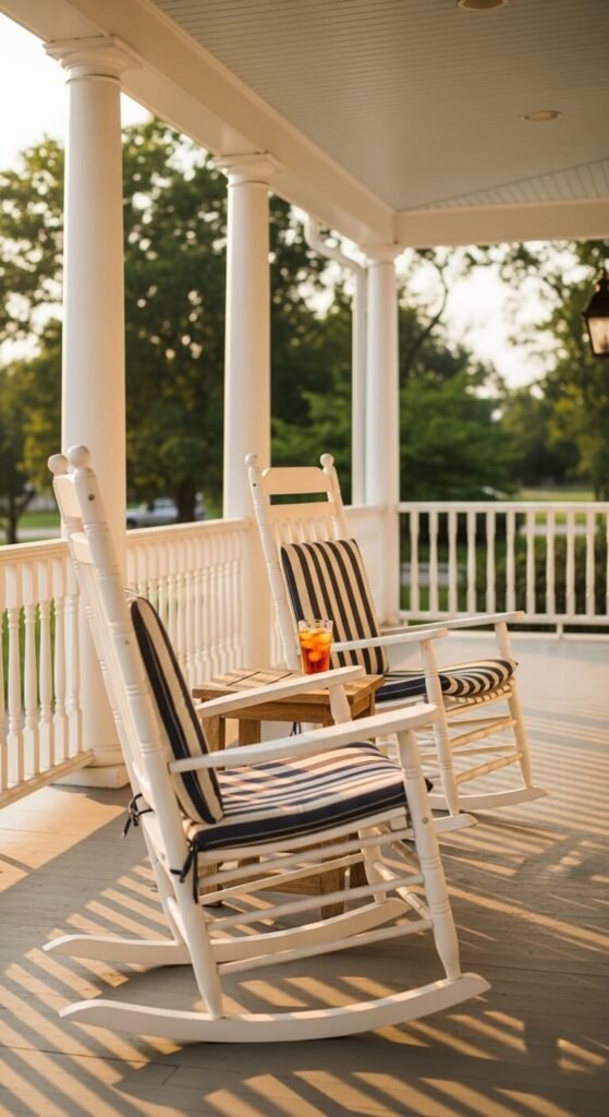 Nothing communicates welcome quite like a pair of rocking chairs on a front porch. Choose chairs sized to your porch width — two chairs with a small table between them is the classic arrangement. Painted wood rockers are traditional and cost $60 to $150 each depending on quality. Add weather-resistant cushions with ties so they stay put in wind. Outdoor fabric cushions in a bold stripe or solid color give the chairs personality. If the porch is small, one chair placed at an angle with a side table works just as well. Oil or repaint wood chairs every two to three years to maintain the finish.