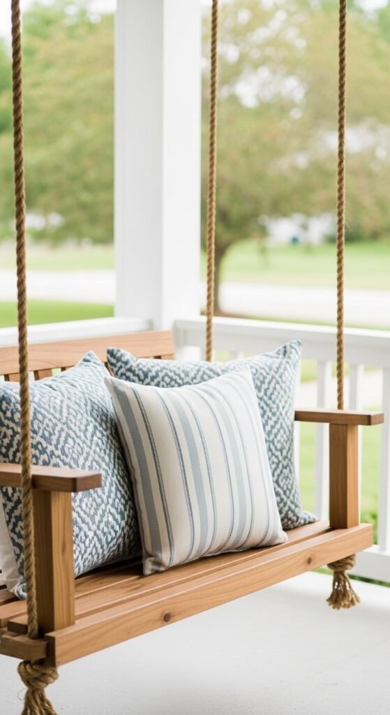 A porch swing is one of those pieces that immediately makes a porch feel like a place to stay rather than just pass through. Hang it from ceiling joists — not just the porch ceiling boards — using heavy-duty eye bolts rated for at least 500 pounds. Cedar and pine swings are widely available for $80 to $200. Add three to five outdoor throw pillows for color and comfort. Choose weather-resistant pillow covers in patterns that relate to your door color. A porch swing that fits the space well — not so wide it crowds the porch — becomes the most-used piece of porch furniture you will ever own.
