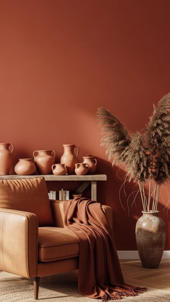 Gray dominated for years, but warm neutrals are back. Think terracotta, camel, clay, and warm beige. These colors make rooms feel cozy year-round. Paint one accent wall in a warm tone—Sherwin Williams’ Canyon Clay works beautifully. Swap gray throw pillows for rust or ochre versions. Thrift leather chairs in tan or cognac for $30-75. Add terracotta pots for plants. These earthy shades photograph well and pair with both modern and traditional furniture. Your space feels grounded and inviting.