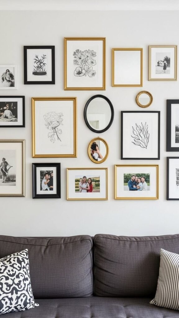 Blank walls waste opportunity. Create gallery walls with frames in varying sizes. Lay your arrangement on the floor first, then transfer to wall with painter’s tape marks. Mix frame colors but keep mat boards consistent. Combine art prints from Etsy, family photos, and thrift store finds. Keep spacing at 2-3 inches between frames. Command strips work for lightweight pieces—no holes required. This personalized art wall costs under $100 and becomes your room’s focal point.
