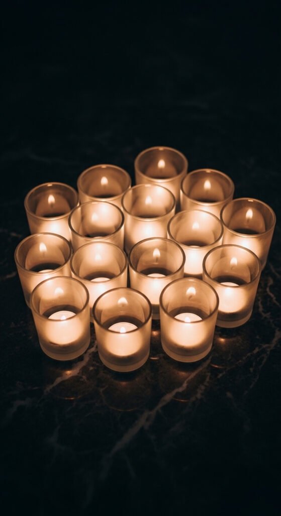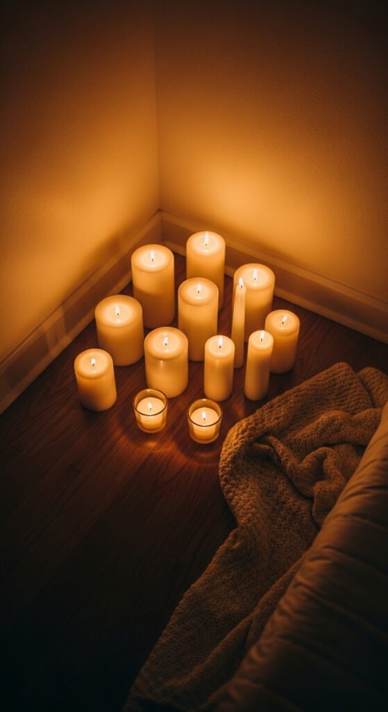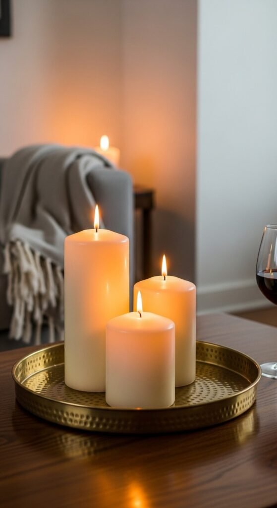 Group ten to fifteen candles in a corner, mixing heights and vessels. Place the tallest at the back and shorter ones in front, like a small staircase of light. Always use heat-safe surfaces — a large ceramic tile or stone tray under the grouping protects wood floors.