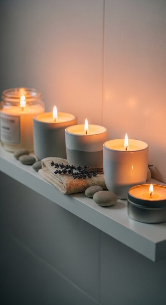 A dedicated candle shelf in the bathroom keeps your scented candles looking styled rather than scattered.