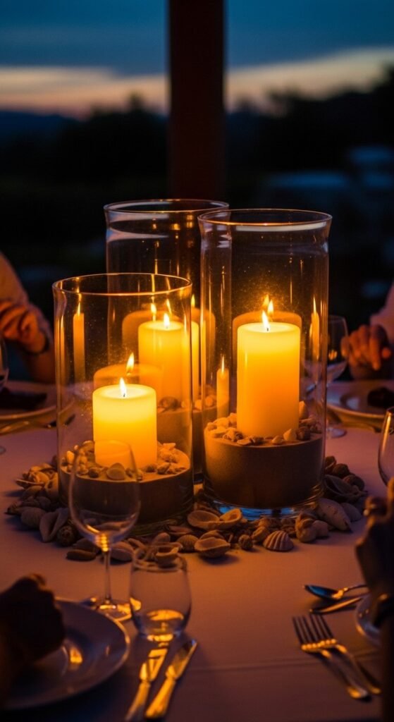 Group three hurricanes in different heights at the table center. Fill the base of each with sand, gravel, dried flowers, or coffee beans before placing the candle — it elevates the candle to the right height and adds texture visible through the glass.