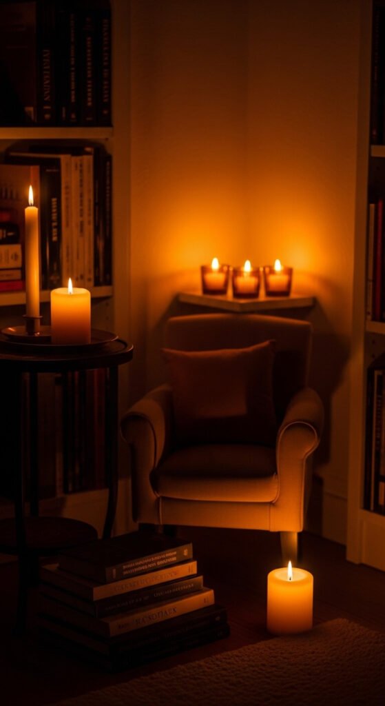 Candles placed at different heights around a reading chair create a cocoon of warm light that makes reading feel like a ritual.