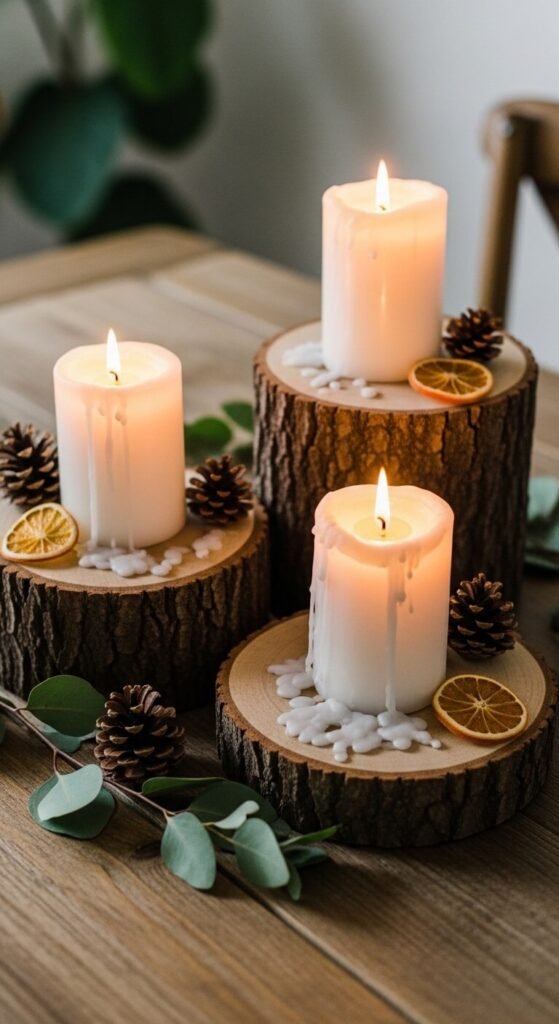 Natural wood slices used as candle bases add an organic, earthy quality that suits farmhouse, boho, and Nordic interiors beautifully.