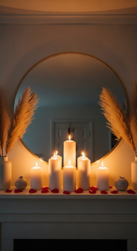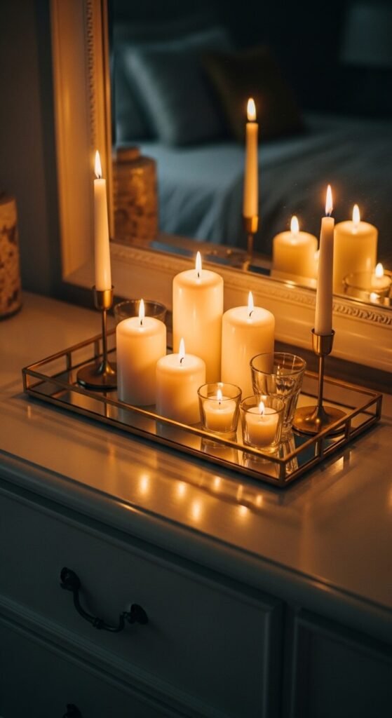 Use a mirrored tray in front of the mirror for even more light multiplication. Pillar candles in matching colors — all white, all cream, or all black — look more cohesive than mixed colors. The entire setup can be assembled for $30–$50.