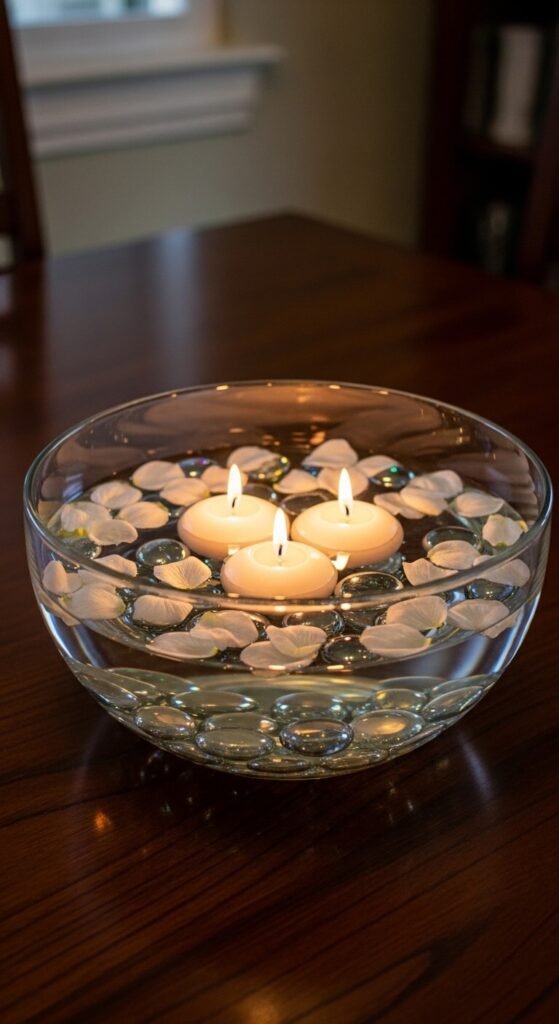 Fill any shallow bowl or large glass vase with water, scatter flower petals or glass pebbles on the surface, and float two to four small candles. The water amplifies the flame’s reflection and makes the whole arrangement shimmer.