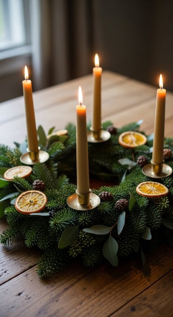 A candle ring — four candles set within a circle of greenery — is one of the most timeless seasonal candle arrangements across any tradition or style.