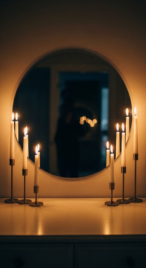 Brass taper holders are the most universally flattering choice. Slim black metal holders work well in modern or minimal spaces. The mirror reflection doubles the candles, so six holders create the visual effect of twelve. Total cost for holders and candles: $25–$45.