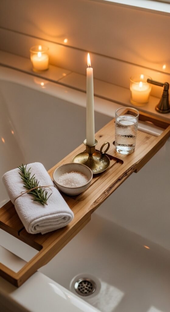 Wooden bath trays with adjustable width cost $20–$40 on Amazon. Pair with a lightly scented candle — lavender, chamomile, or eucalyptus — and the combination of warm water, flickering light, and scent is genuinely restorative.
