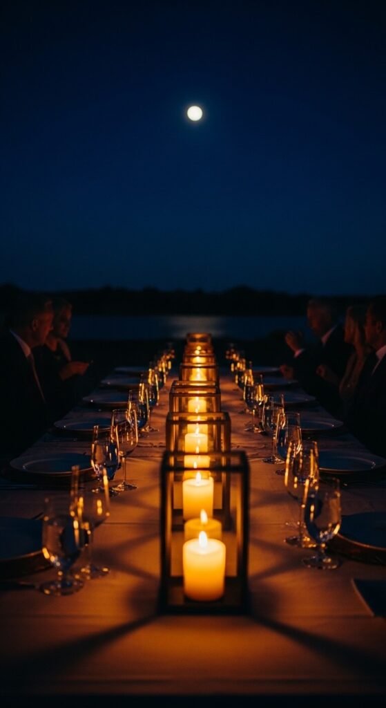 25. Moonlit Outdoor Table with Candlelit Lanterns