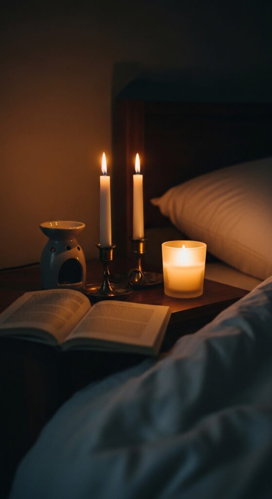 A small candle vignette on the nightstand turns bedtime into something you look forward to.