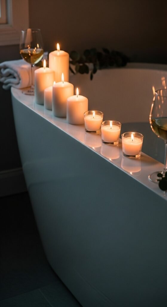 Use a combination of pillar candles, votives, and tealights in glass holders for a layered glow. Space them evenly along the tub ledge and vary the heights slightly. The reflection off the bathwater multiplies the light dramatically.