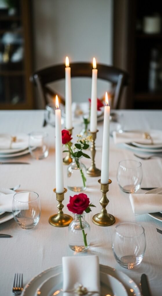 Brass taper holders cost $6–$20 each. Mix heights — some tall, some short — for a less formal, more layered look. White, ivory, and black tapers all photograph beautifully against a candlelit dinner table.