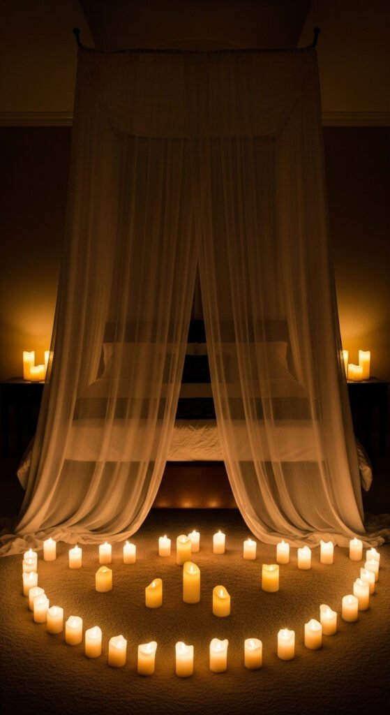 Placing a ring of candles on the floor around the bed creates a cinematic, completely immersive romantic atmosphere.