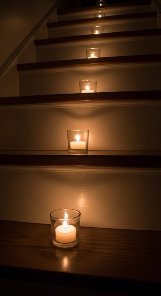 Glass tea light holders cost $6–$10 for a pack of twelve. Place one on each step at the same position — center, left edge, or right edge — for a deliberate, rhythmic look. Light them from the top down so you don’t blow out the lower ones as you climb.