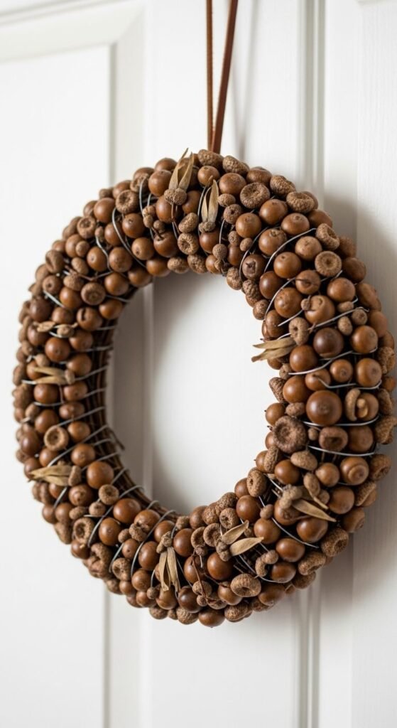 An acorn wreath is one of the most charming fall DIY projects you can make with completely free materials. Collect a large quantity of acorns from outside — you’ll need more than you think. Form a wreath base from gathered twigs wired into a circle. Hot glue acorns tightly across the entire surface in a mosaic pattern. Let the glue dry fully, then hang with a thin strip of leather or twine. This wreath works beautifully on interior doors, above a bed, or on a blank wall. Total cost: the price of a glue stick refill, which is about $2.