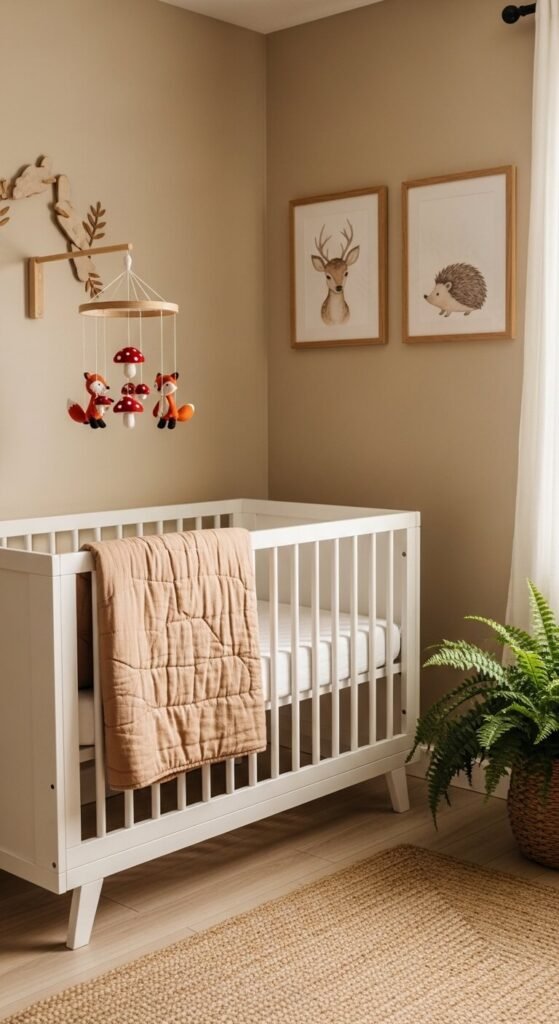 Foxes, deer, hedgehogs, and owls create a warm, organic nursery that feels connected to nature without being overly themed. Stick to a muted palette — warm beige, rust, sage green, and cream — so the room ages well as your child grows. Find woodland watercolor prints on Etsy for $5–$15 each, print them locally, and frame with simple wood frames from the dollar store. A DIY felt mobile with animal shapes costs under $10 in materials. This theme works beautifully for any gender.