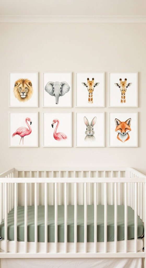 A gallery wall of matching animal portraits makes an immediate visual impact and grows beautifully with the child. Download free watercolor animal illustrations from Creative Market or Etsy (many sellers offer free samples), print them at a photo lab in matching sizes, and frame them in identical frames from the dollar store. Six framed prints cost under $25 this way. Arrange them symmetrically above the crib or changing table. Add one or two more prints each year as the child develops favorite animals. Easy to refresh, impossible to outgrow.