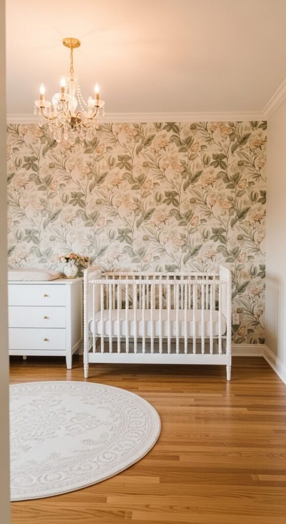 A floral wallpaper accent wall creates an instant, high-impact nursery with almost no additional decorating required. Peel-and-stick wallpaper ($30–$80 per roll) is renter-friendly, repositionable, and applies in an afternoon with no professional help. Choose large-scale botanicals in muted tones rather than bright primary florals for a more refined, lasting look. Let the wallpaper do the heavy lifting — keep the crib, dresser, and rug in white or cream so the pattern stays as the clear focal point. One wall, one roll, total transformation.