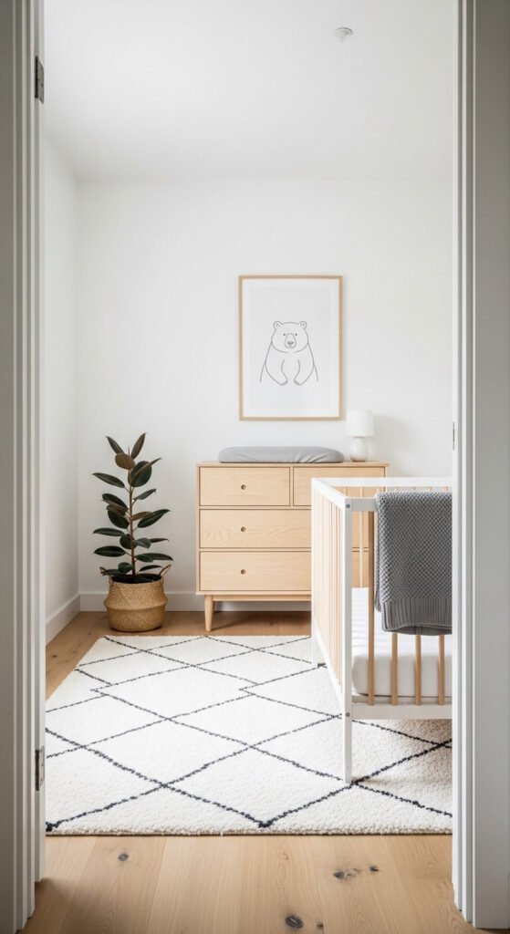 Black and white nurseries are bold, sophisticated, and — importantly — highly stimulating for newborn visual development. High-contrast patterns are actually what babies’ eyes can best detect in the first weeks of life, making this theme as functional as it is stylish. A black and white geometric mobile, striped rug, and a single large abstract framed print deliver strong visual contrast. Add a warm wood or natural fiber element — a rattan basket, a wooden shelf — so the room doesn’t feel cold. This theme photographs exceptionally well in any lighting.