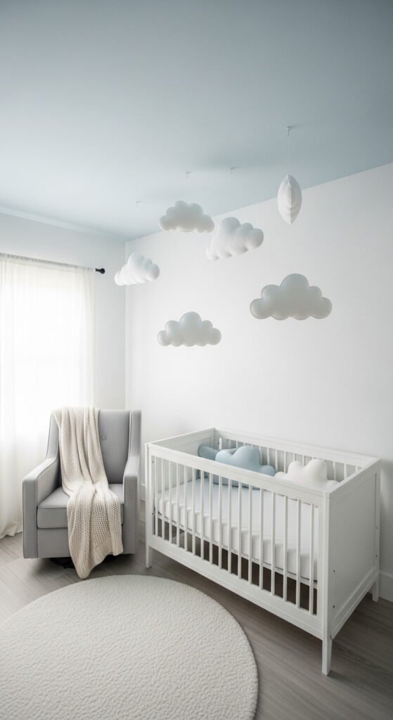 Nothing communicates peace and calm quite like a sky full of soft clouds. A pale blue ceiling with white walls immediately creates the feeling of an open sky — a powerful visual cue for a sleep-focused room. DIY felt or cotton cloud shapes suspended from the ceiling with clear fishing line cost $5–$10 total to make. A cloud mobile, cloud wall art, and cloud-shaped accent items reinforce the theme gently throughout. Keep everything light and airy — avoid dark accents that would interrupt the serene, dreamy atmosphere.