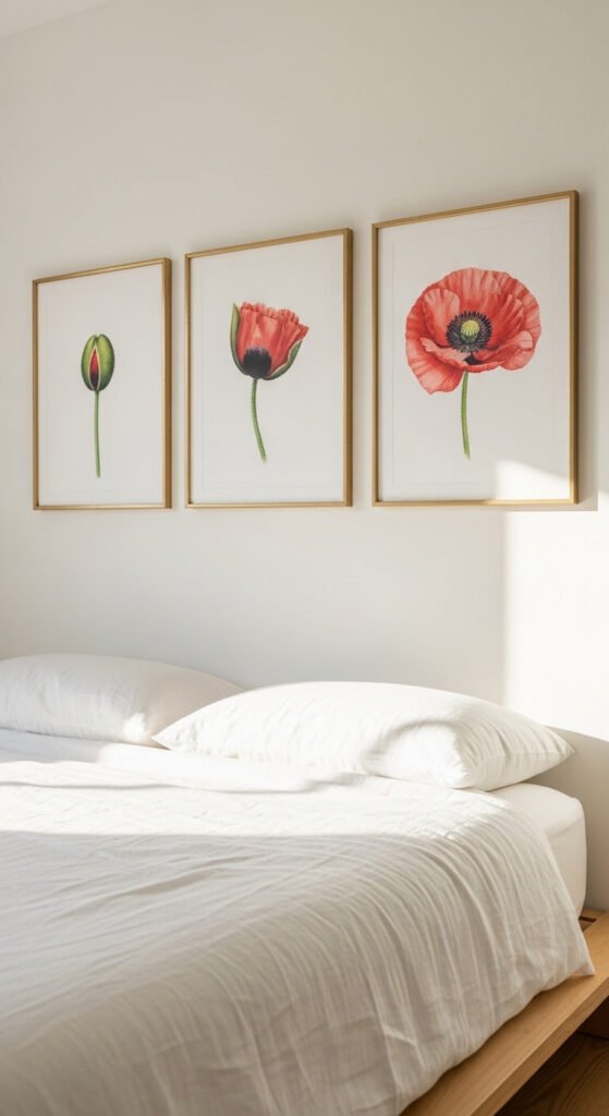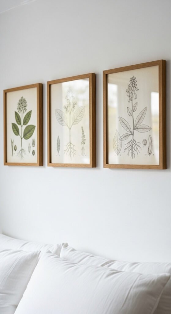 A botanical triptych presents three related prints as a single unified artwork above a bed or sofa. The most effective approach uses the same plant at different stages — a bud, a half-open bloom, and a fully open flower — or three specimens from the same plant family. The sequential nature gives the triptych a narrative quality that a random grouping lacks. Print three images in matching sizes. Frame in identical frames. Space them evenly — two to three inches apart — and hang at the same horizontal height. This creates a deliberate, gallery-quality display for under $40 using printed digital downloads and affordable frames.