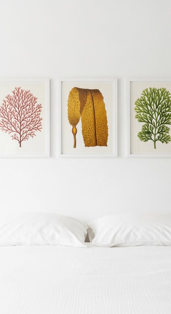 Seaweed and coastal plant prints draw from the same Victorian natural history tradition as herbarium studies but with a marine focus that suits coastal, bathroom, and relaxed living room settings. Anna Atkins — the 19th-century botanist credited with creating the first photographically illustrated book — produced hundreds of cyanotype seaweed prints that are now in the public domain. Many of these are freely downloadable in high resolution. Print on cream or pale blue-tinted paper for a coastal tone. A set of three seaweed prints in white frames costs under $25 and gives a bathroom or bedroom a quiet, nature-connected quality.