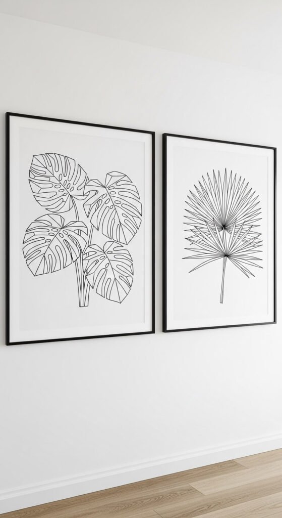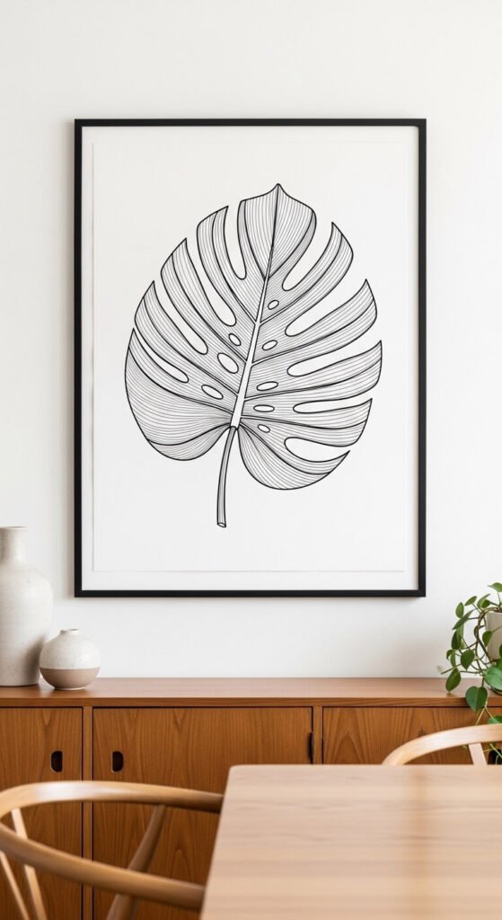 A single oversized botanical print used as the only piece on a wall makes a stronger statement than a cluster of small frames. The large scale gives the plant illustration the same presence a portrait or landscape painting would have. Choose a print with strong graphic quality — a single monstera leaf, a detailed fern frond, or a palm branch — in black on white or deep green on cream. Print sizes of 24×30 or 18×24 inches work best for this approach. Online print services produce large format prints for $10–$20. Add a simple black frame and the total cost stays under $40.