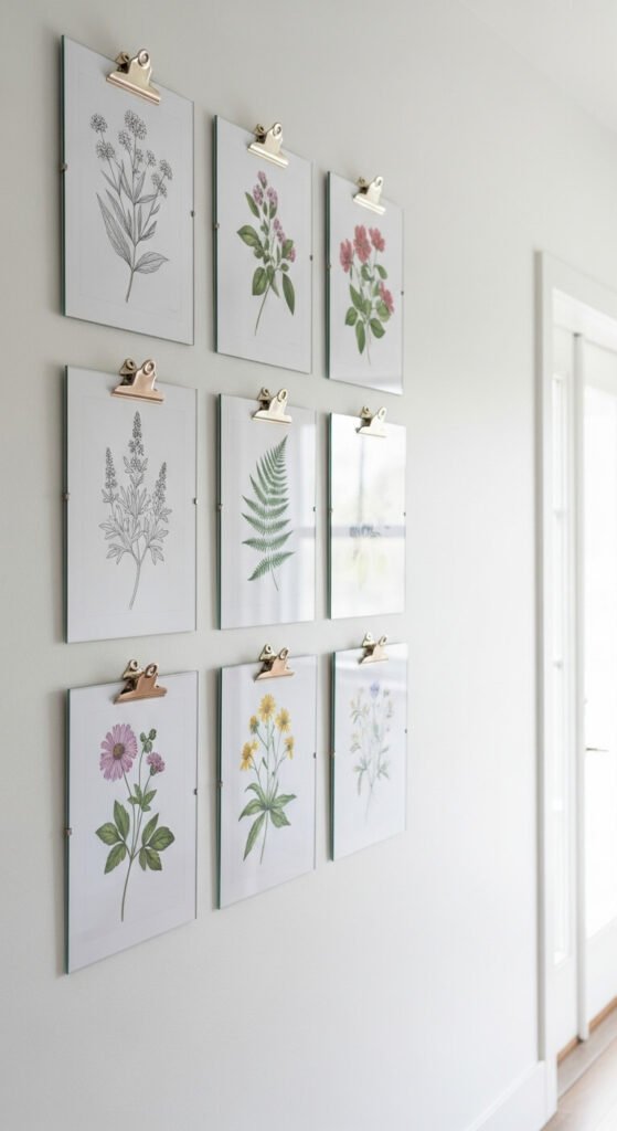 Clip frame botanical displays use frameless glass-and-clip frames that cost $2–$5 each, making a large botanical print collection genuinely affordable. A set of eight prints in clip frames costs $15–$40 total including printing. The minimal frame profile keeps attention on the prints rather than the frames. This approach works well for hallways and rental apartments where you may want to swap prints regularly. Print botanical images in a mix of styles — some line art, some watercolor — for variety within a cohesive display. Clip frames hold any paper weight up to about 200gsm and are widely available in standard A4 and A5 sizes.