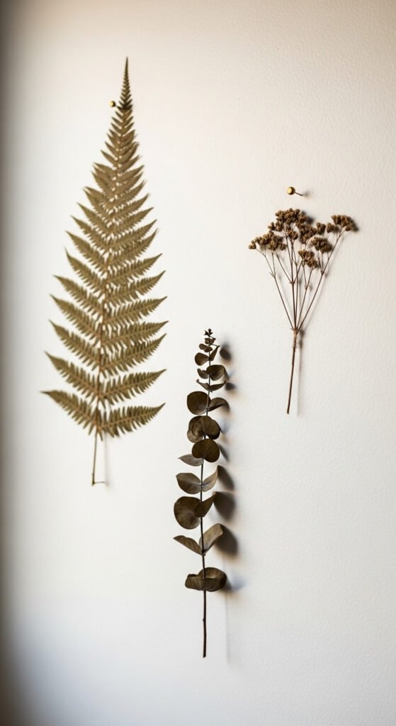 Dried botanicals mounted directly to a wall skip the frame entirely and use the plant material itself as the art. A large pressed fern pinned flat against white plaster, a dried eucalyptus branch secured with two small brass map pins, or a cluster of dried wildflowers mounted in a loose arrangement — these are all zero-cost options if you have access to garden plants. Pressing takes two to three weeks in a heavy book. Mount using map pins, adhesive putty, or thin staples. The dried material casts its own shadow onto the wall, adding a three-dimensional quality that no framed print can replicate.