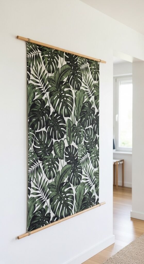 A botanical print fabric hanging uses printed textile rather than paper to bring plant imagery onto a wall. The softness of the fabric and the slight texture of the weave give botanical prints a warmth that rigid framed prints lack. Fabric with tropical or botanical prints is widely available from online fabric retailers for $6–$15 per meter. Cut to size, hem the top and bottom edges, and thread a wooden dowel through the top hem for hanging. The total cost for a 60x80cm fabric hanging is $10–$20. The botanical pattern reads as art while also softening the acoustic quality of the wall behind it.