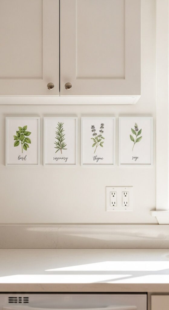 A watercolor herb print set in a kitchen is one of the most practical-feeling botanical displays in the house. The subject matter — basil, rosemary, thyme, sage — connects directly to what happens in the kitchen every day. Sets of four matching herb prints are widely available as digital downloads for $5–$12 on Etsy. Print at home on white card stock and frame in matching white or natural wood frames. A complete set of four framed prints costs under $30. Hang in a tight horizontal row just above the counter or backsplash. The small scale and clear subject matter work particularly well in a busy kitchen environment.