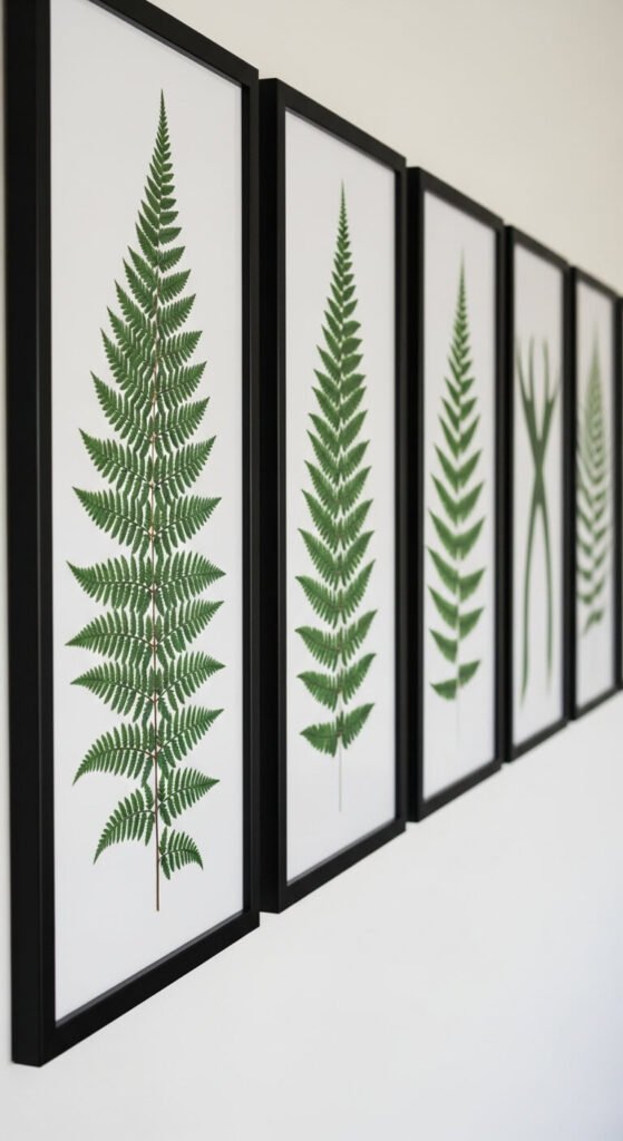 A fern frond print series displaying different fern species side by side creates a naturalist display that rewards close attention — each variety has a completely different leaf structure and growth pattern. This type of species comparison is one of the oldest traditions in botanical art. Source individual fern illustrations from public archives or purchase a matching digital set. Print five in the same size and frame identically. Hang in a horizontal row at eye level. The deep forest green ink on white paper works well in studies, libraries, home offices, and reading corners where the intellectual quality of the natural science aesthetic feels appropriate.