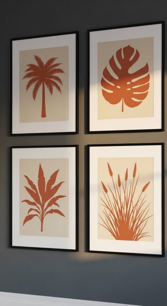 Botanical silhouette prints reduce plant forms to flat, solid shapes — no internal detail, no line work, just the outline of the plant in one color against a plain background. This style works in more graphic, contemporary interiors where traditional botanical illustration might feel too detailed. Terracotta on cream, black on white, and deep green on blush are all effective color combinations. You can create your own silhouette prints by photographing a plant against a bright window, converting the image to a flat silhouette in any free photo editing tool, and printing the result. Total DIY cost: under $10 including paper and frame.