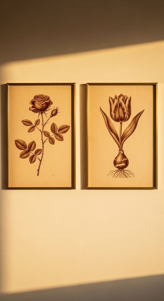 Sepia-toned botanical prints give botanical illustration the warm, aged quality of antique photography. The brown tones work better than black-and-white in warm interiors with cream walls, wooden floors, and natural materials. Convert any botanical line art to sepia tone using a free photo editing tool before printing — the process takes two minutes. Print on warm-toned cream paper rather than bright white for the most authentic antique look. A pair of sepia botanical prints in brass or warm gold frames costs $15–$25 total. They suit traditional, rustic, and warm-toned Scandinavian interiors particularly well.